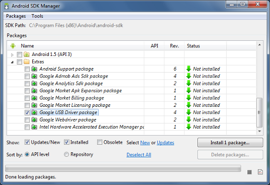 - En la última carpeta que aparece «Extras«, seleccionar Google USB driver y pulsar en «Install packages«. Después aceptar la licencia y pulsar «Install«. Cuando termine, cerrar el programa.